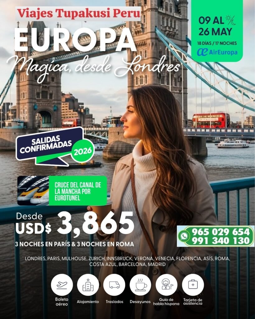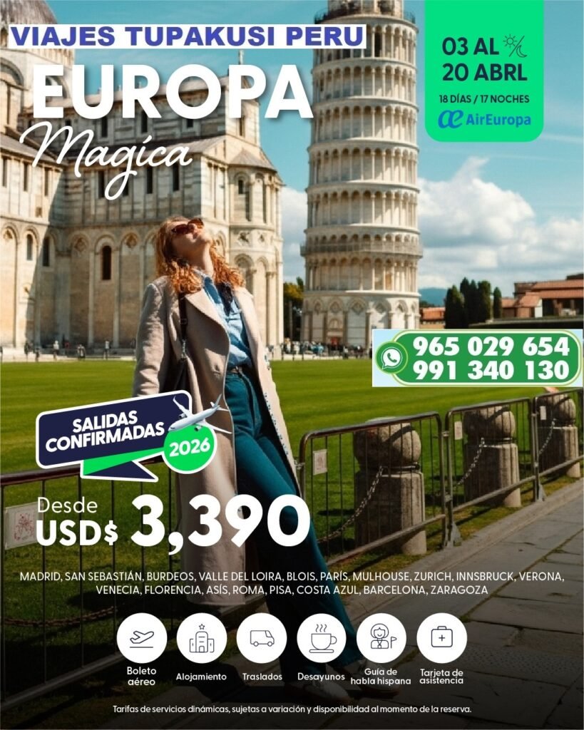 VIAJA ALREDEDOR DEL MUNDO América, Europa, Asia, Africa Compra con Anticipación…  Comenzamos FULL DAY LIMA Provincias e ICA – 2026 Novedades 2026 Lo mejor de EUROPA 2026, con Aéreo Lo mejor en CRUCEROS – año 2026 Nosotros: Viajes Tupakusi Peru Es una Agencia de Viajes con más de 14 años de Experiencia. Está ubicada en Lima, Perú, Sud América. Tenemos muchos paisajes, vegetación, aves, etc. única en su género.AnÃmese a visitarnos, tenemos muchos tours para su deleite.